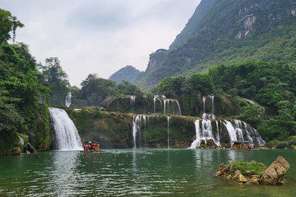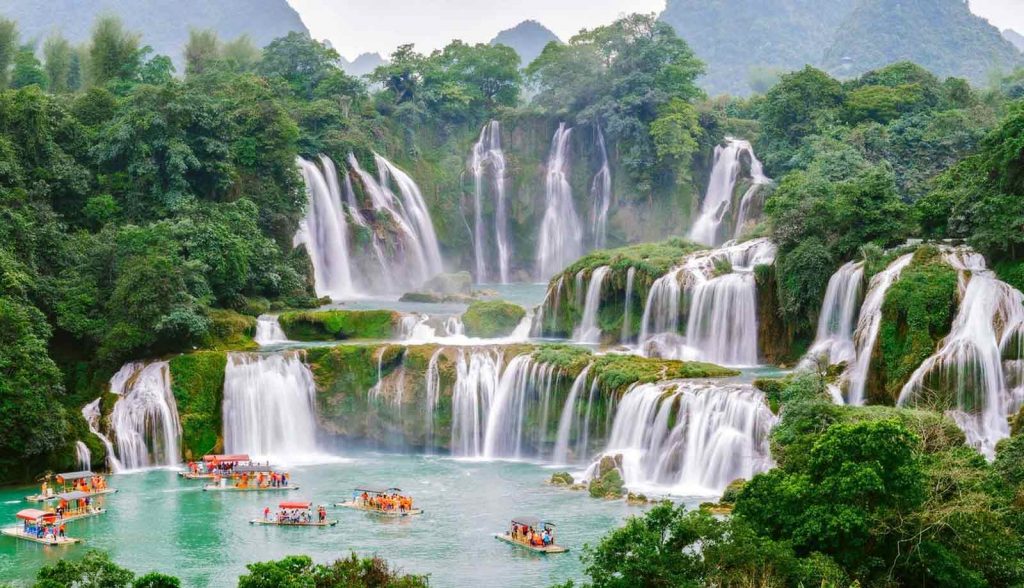 Located on the border between Vietnam and China, Ban Gioc is one of the most spectacular and majestic waterfalls in all of Asia. The falls cascade down a three-tiered cliff, spanning over 300 meters in width, creating a stunning curtain of white water set against a backdrop of lush green jungle and limestone peaks. The sound is thunderous, and the spray creates a refreshing mist in the air.